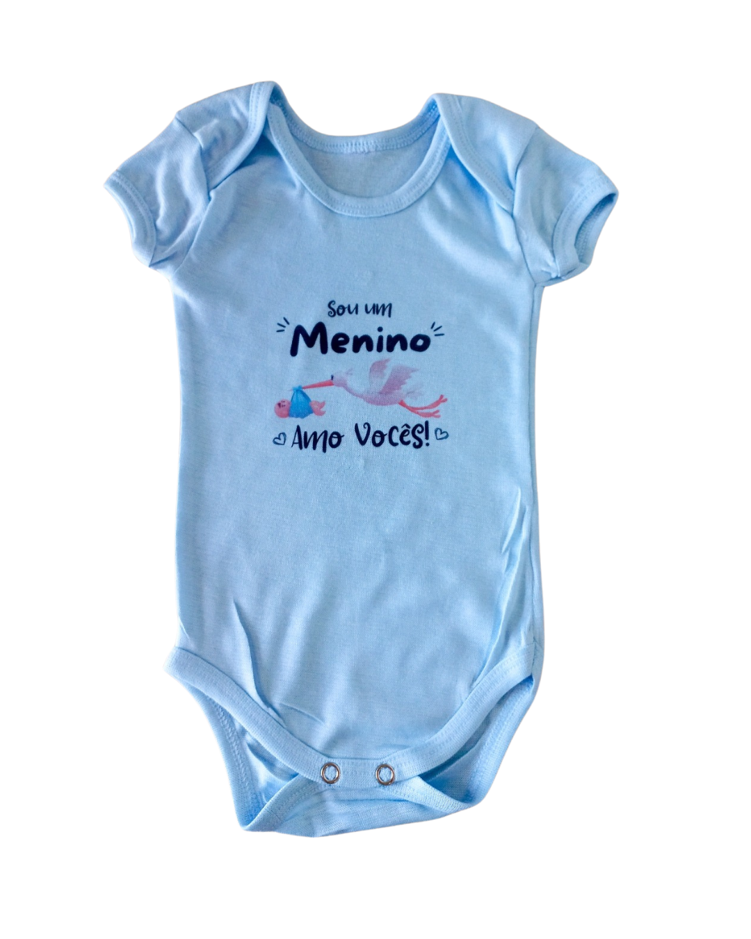 Body azul "Sou um menino. Amo vocês!". Ideal para Chá Revelação. Crie memórias insta com nossos produtos.