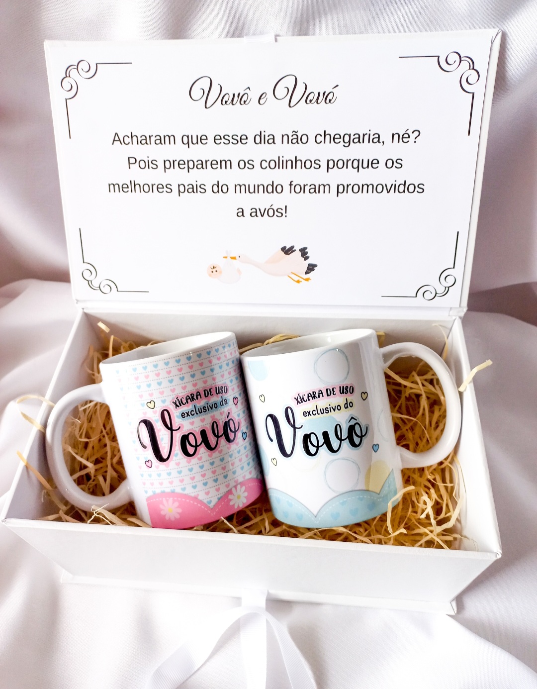 Caixa Revelação de Gravidez para a Vovó e o Vovô com duas canecas de cerâmica 325 ml “Xícara de Uso Exclusivo da Vovó” e “Xícara de Uso Exclusivo do Vovô”. Tamanho da caixa 24 comp x 14 larg x 10 altura cm. Gravado "Com carinho" em cima da caixa. Caixa na cor Branca. Mensagem na contracapa conforme a foto.